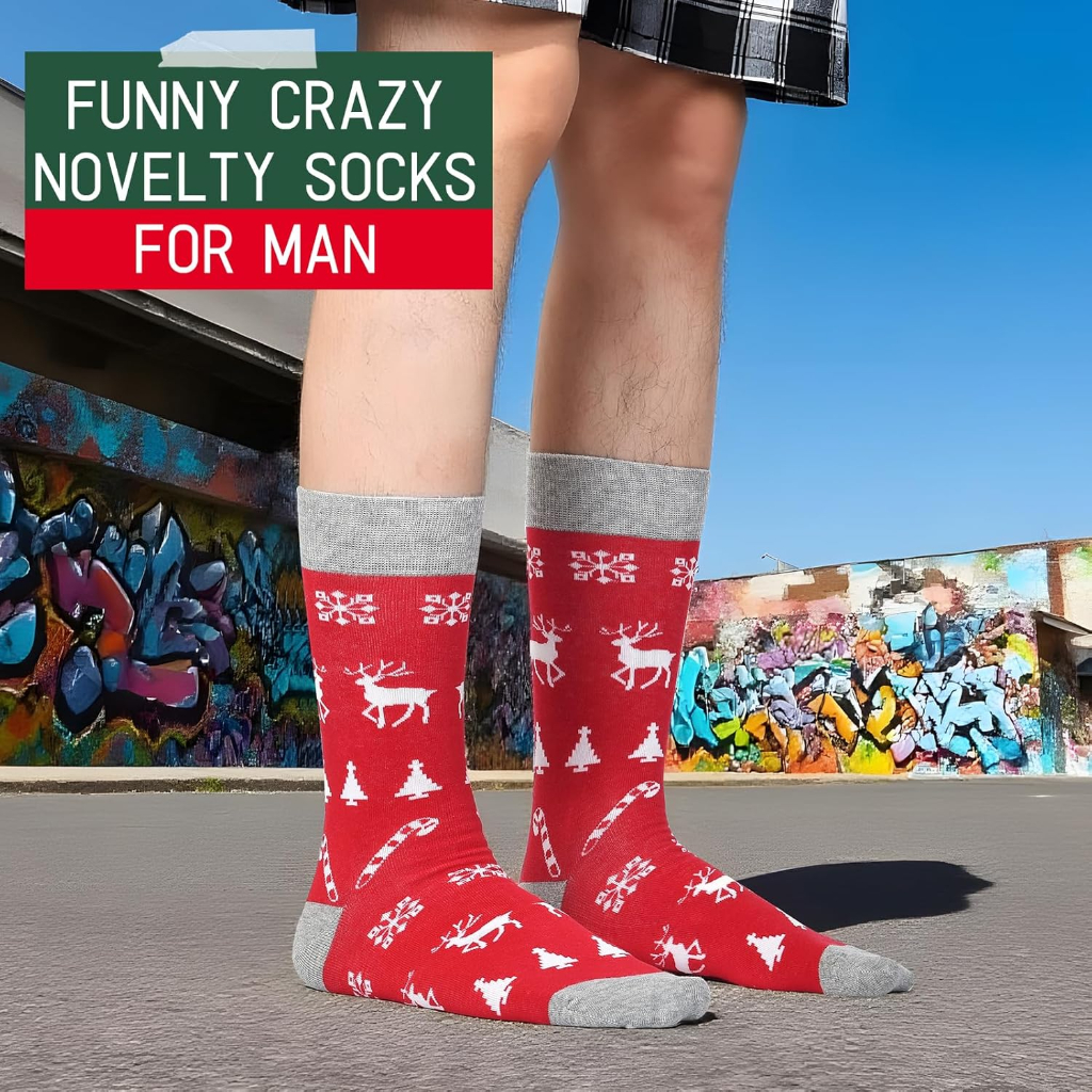 The 4 Pairs Of Fun Patterned Cotton Socks For Men provides a selection of patterned crew socks designed for individuals who prefer visually themed accessories for daily wear, workplace routines, or seasonal activities. This four-pair assortment includes different graphic designs suitable for varied styling throughout the week. Each pair incorporates patterns aligned with winter themes, holiday graphics, or general illustrated motifs.