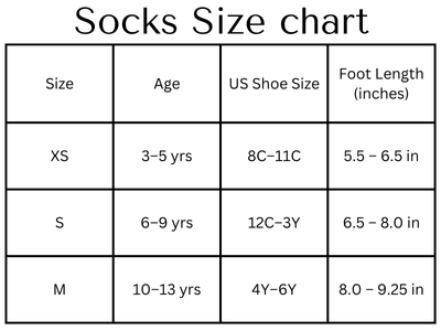 The socks are available in several size categories, supporting a broad age range from early childhood through preteen years.